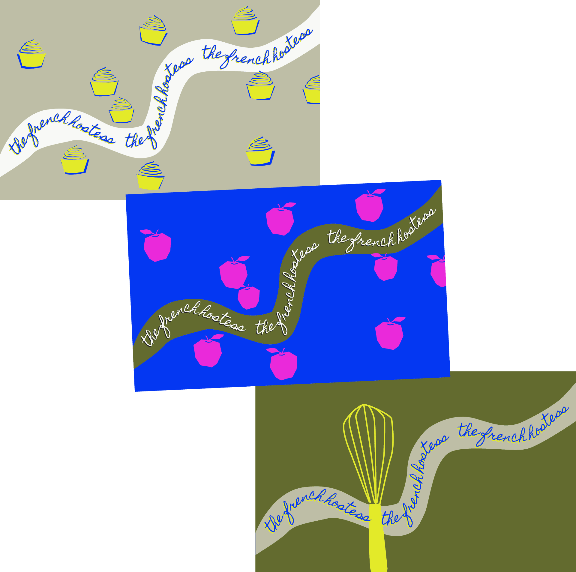 The French Hostess logo captures Emmanuelle’s charm in bold ultramarine, with a swooping script and a playful illustrated face that feels straight out of a French art book.